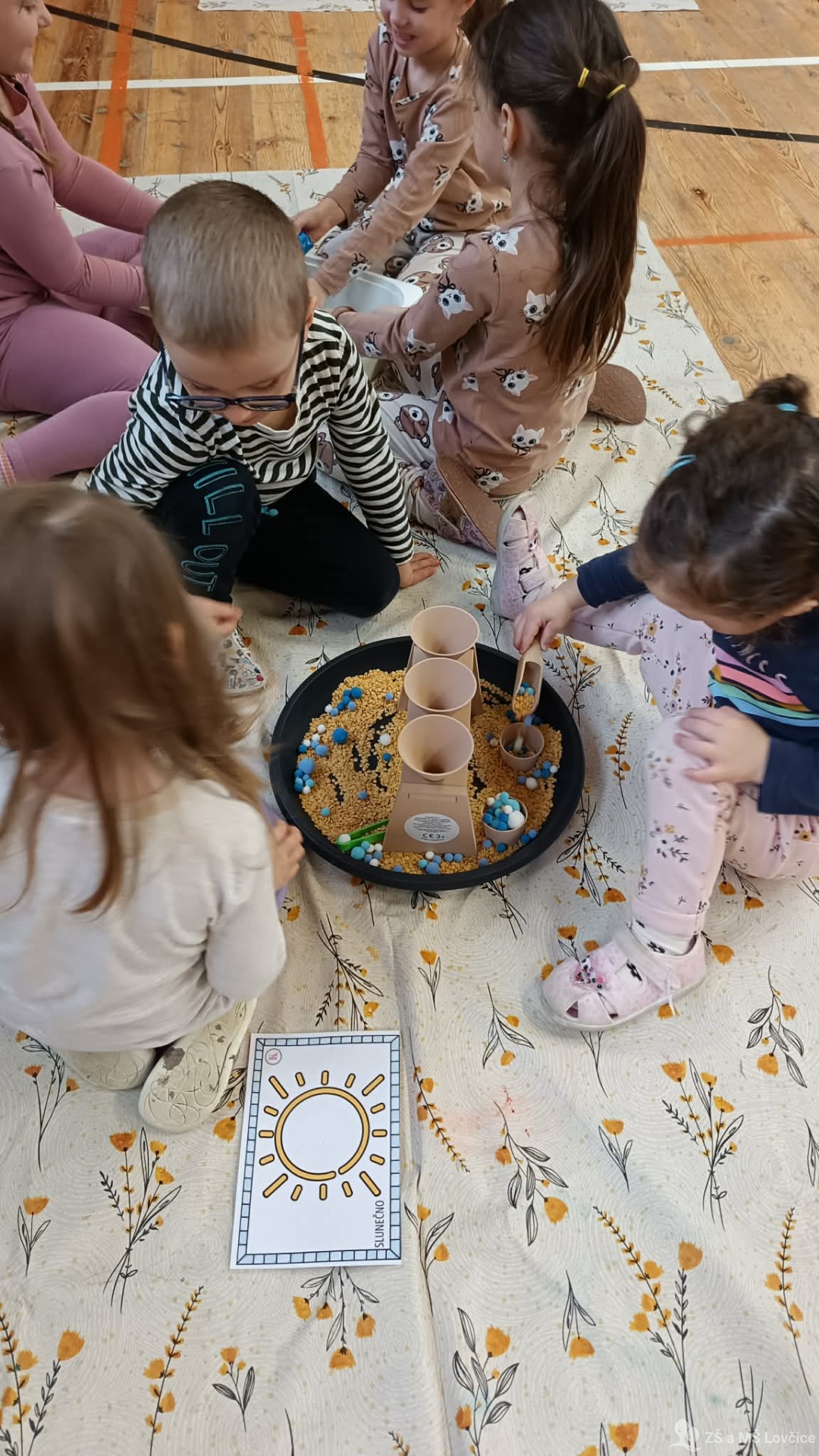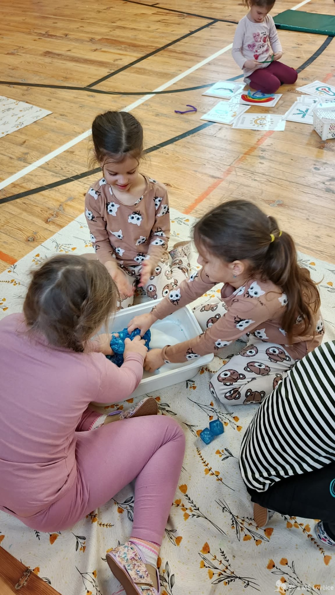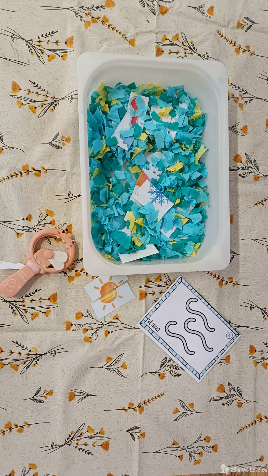 Pro děti byly připravené různé hravé stanoviště – barevná rýžová duha, modrá „obloha“ ze slizu i vesmírná obloha s planetami. S nadšením se pustily do zkoumání a nezalekly se ani bouřky nebo hledání obrázků ve „větrném“ počasí.