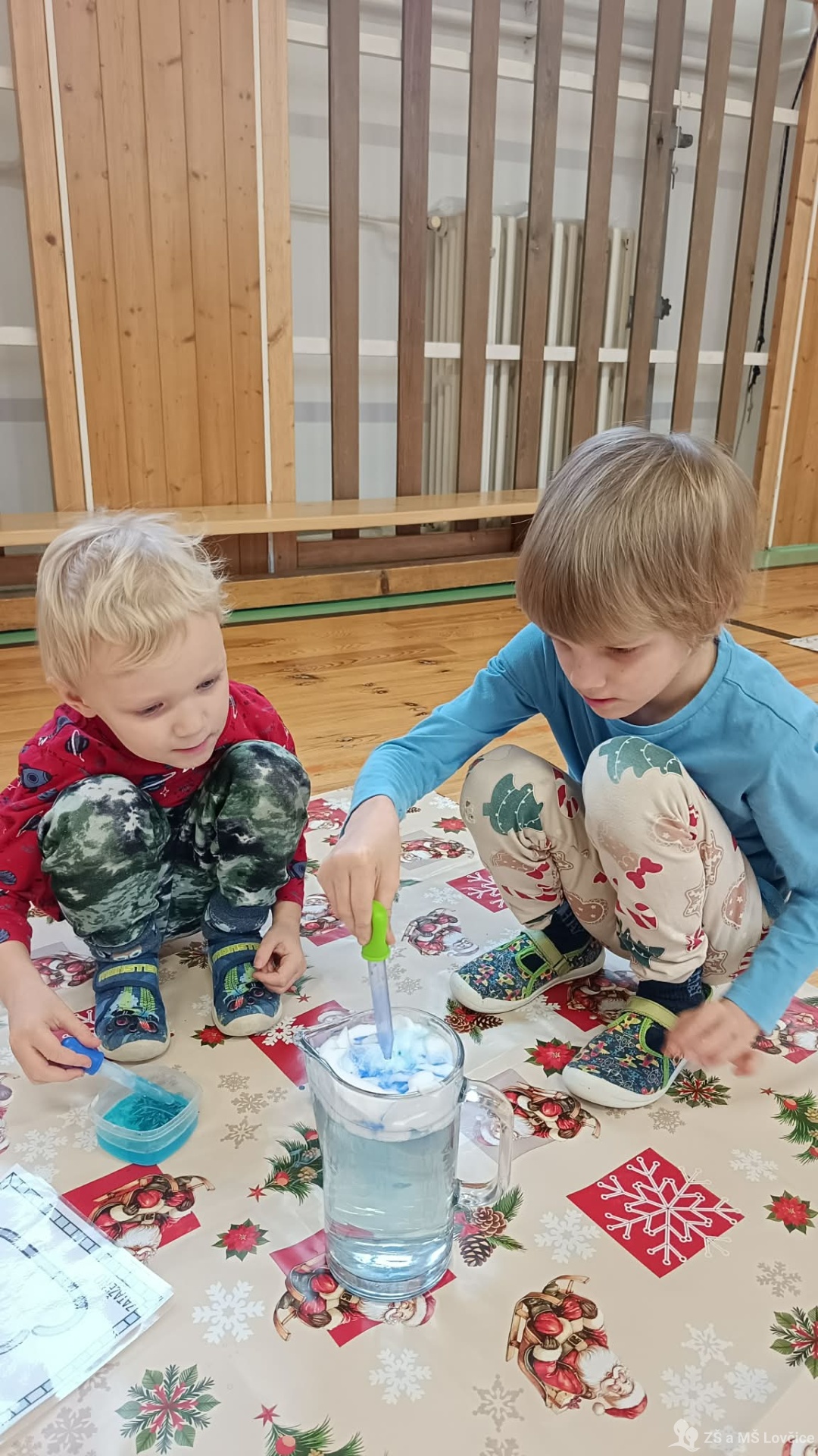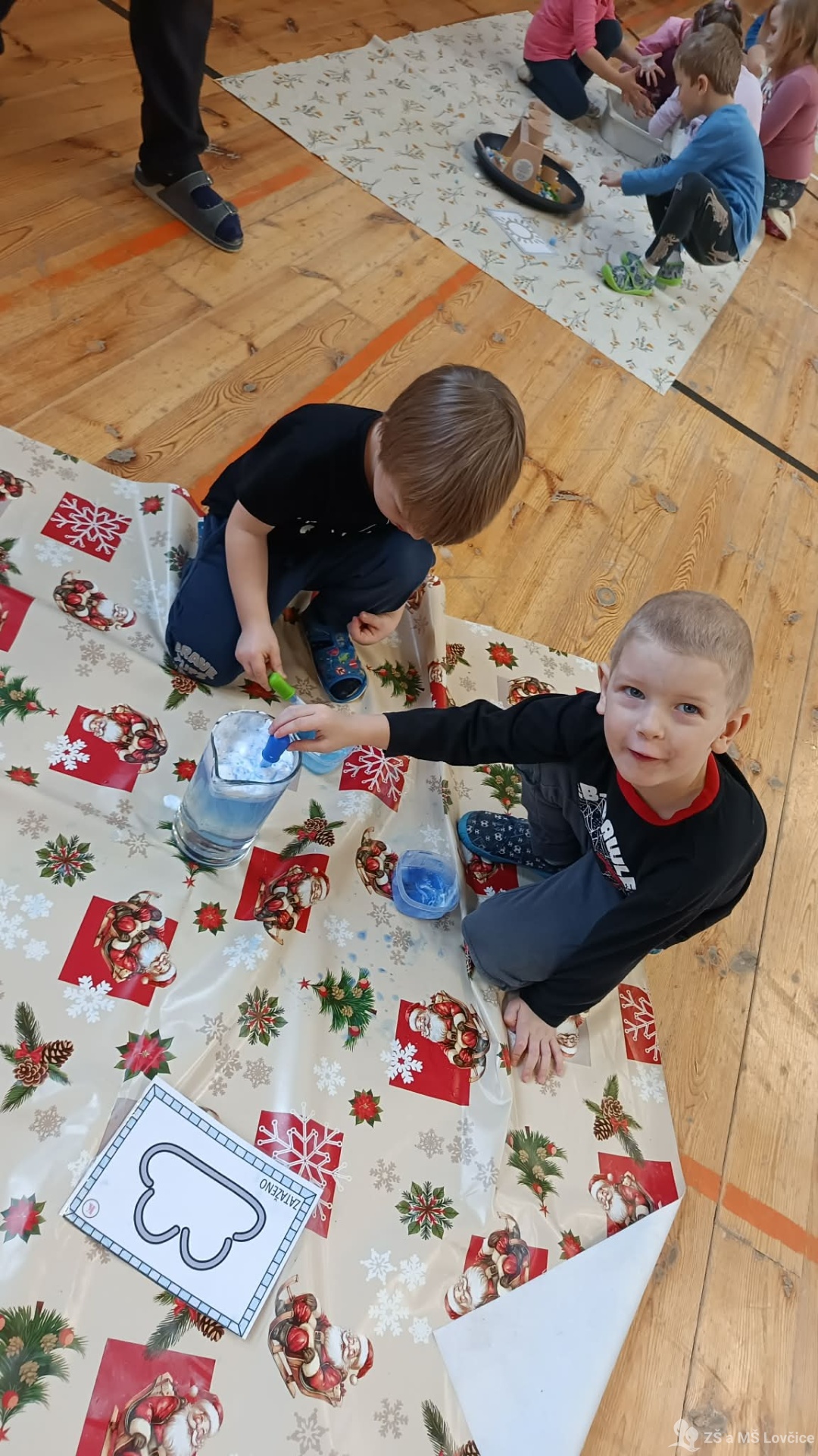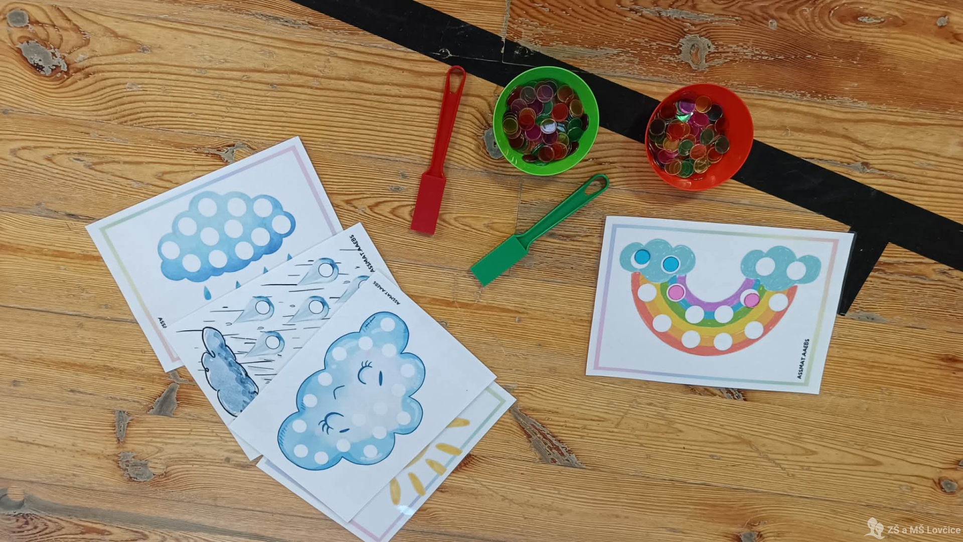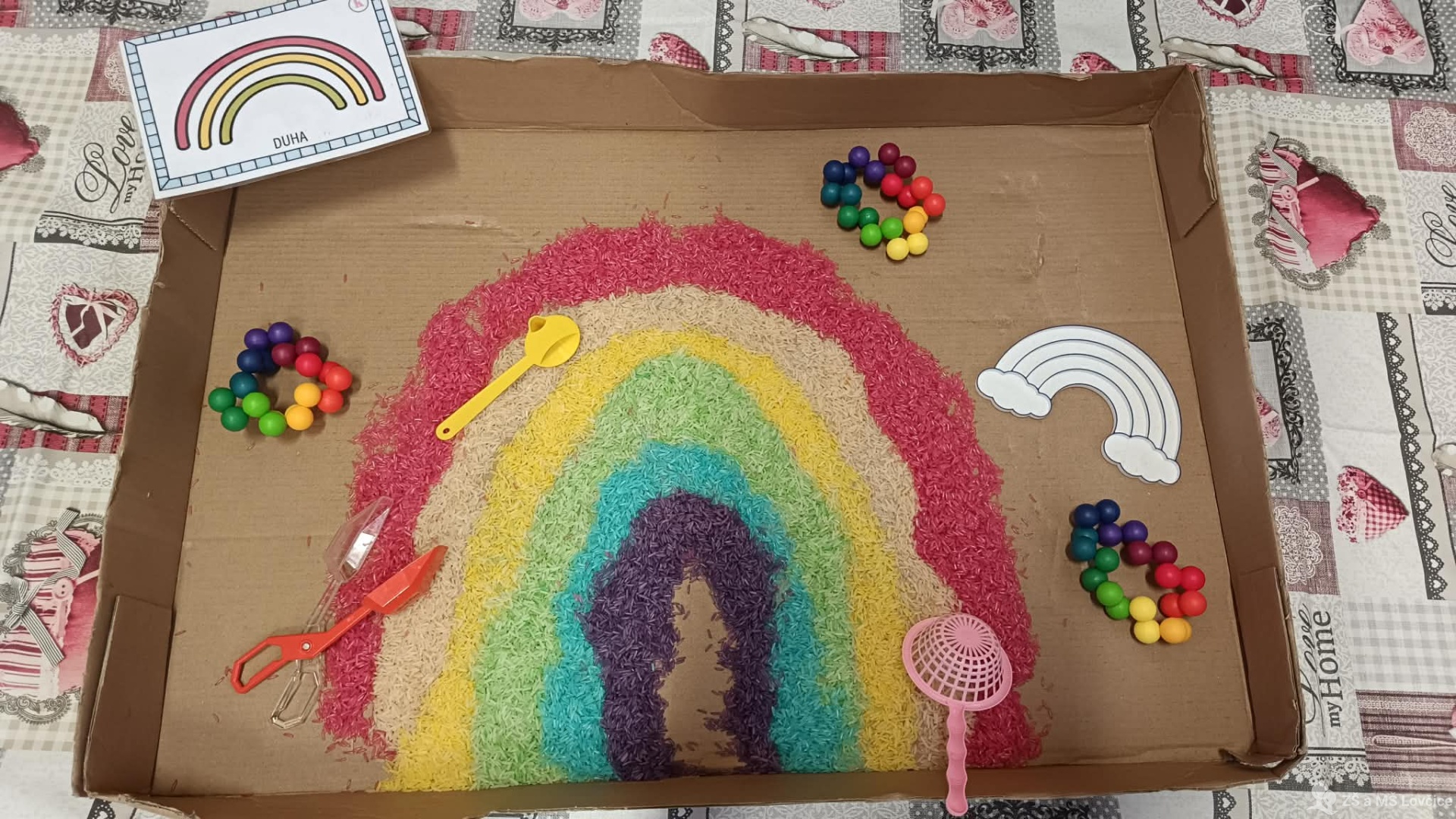 Pro děti byly připravené různé hravé stanoviště – barevná rýžová duha, modrá „obloha“ ze slizu i vesmírná obloha s planetami. S nadšením se pustily do zkoumání a nezalekly se ani bouřky nebo hledání obrázků ve „větrném“ počasí.